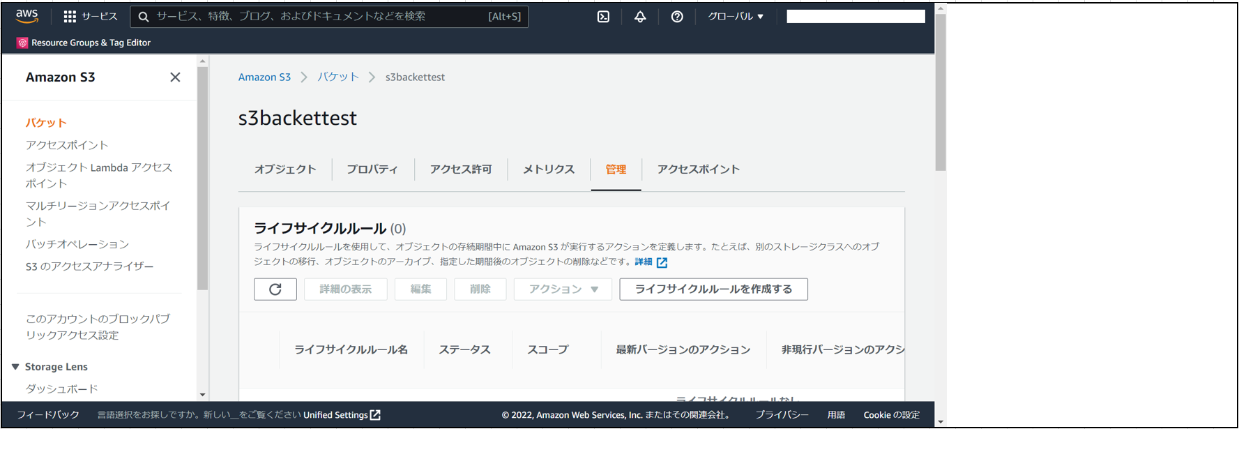 ↓以降はバケット作成後に追加で設定を変更したい場合変更する項目(今回は設定変更はなし)